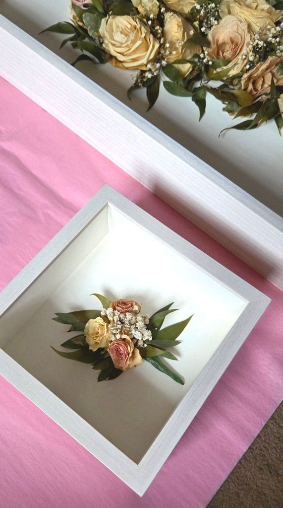 - 2 months after – Your flowers will be fully dried and read for their mock-up. I’ll arrange a catch up with you to discuss the size and style of your frame and the layout of your flowers.